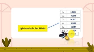 The document discusses the firefly algorithm, which is a nature-inspired optimization algorithm based on the flashing characteristics of fireflies. Fireflies use bioluminescent flashes to attract mates or find prey. The firefly algorithm simulates this behavior with brighter fireflies attracting less bright ones. The algorithm has stages including initializing parameters, generating a firefly population, calculating fitness, and updating positions iteratively as fireflies move toward brighter ones. The firefly algorithm has advantages like efficiency but disadvantages of getting trapped in local optima. It has applications in production optimization problems.