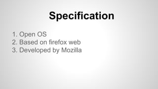 The document outlines the specifications and features of Firefox OS, developed by Mozilla, which offers full access to device hardware and a custom marketplace, but is currently in the development stage and targets only web developers. It includes code snippets for a simple 'Hello World' application in HTML and JavaScript, along with a manifest file. The document highlights the architecture of the OS and its application in low-cost smartphones.