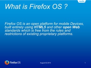 Firefox OS is an open platform for mobile devices built using HTML5 and web standards, targeting emerging markets and providing an alternative to proprietary systems. It aims to create a pathway for users transitioning from feature phones to internet access through affordable devices and applications. Mozilla promotes Firefox OS as a means for developers and partners to generate profit while enhancing openness and innovation in mobile experiences.