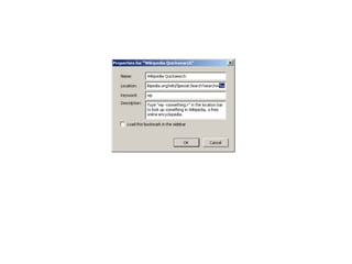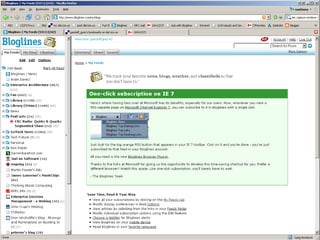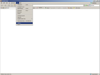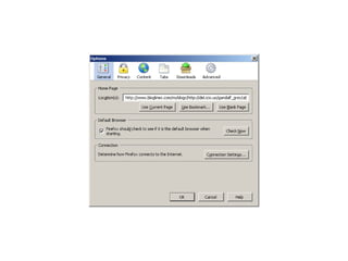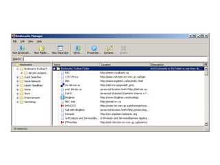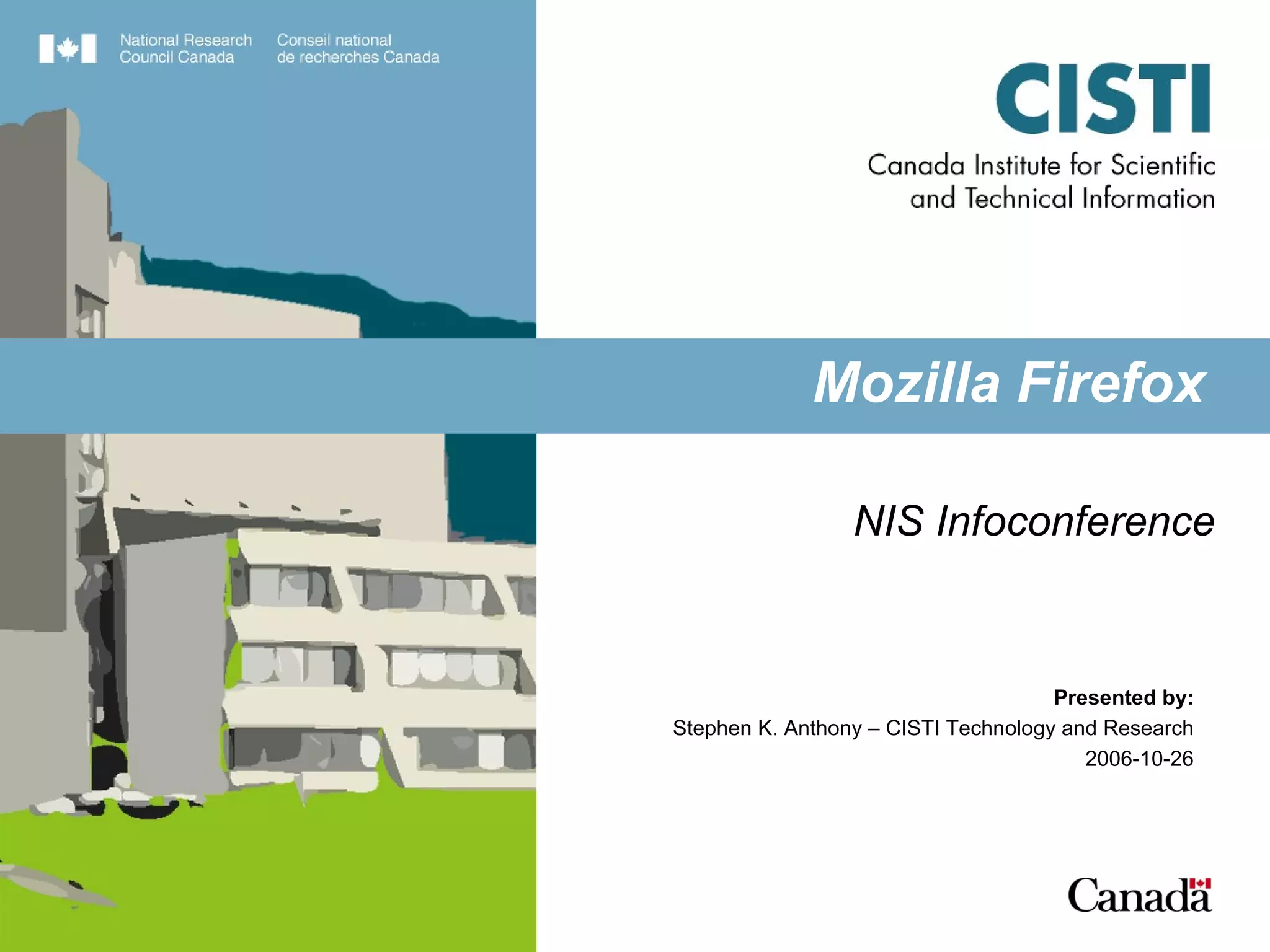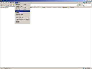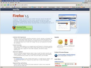 This document summarizes key features and capabilities of the Mozilla Firefox web browser. It discusses Firefox's popularity, supported operating systems, core features like tabbed browsing and privacy controls, its high level of customizability through extensions and modifications, and how it can be useful for libraries through custom searches and tools. The document also provides some example links for more information on Firefox, its extensions, and sync tools.