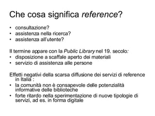 Il documento discute il servizio di reference nelle biblioteche pubbliche italiane, evidenziando la sua importanza per offrire assistenza agli utenti nella ricerca di informazioni. Viene sottolineato il ritardo nell'adozione di nuove tipologie di servizi, soprattutto digitali, e la necessità di superare la scarsa consapevolezza della comunità riguardo alle potenzialità informative delle biblioteche. Il servizio di reference è descritto come un insieme di risorse, strumenti e attività che mirano a soddisfare i bisogni informativi degli utenti attraverso diversi modelli di assistenza.