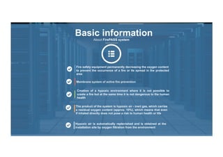 1) The FirePASS system creates a hypoxic environment of around 10-15% oxygen to prevent fires from starting or spreading. This is done through an oxygen filtration membrane that produces hypoxic air on site.