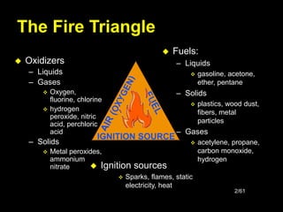 This document discusses fundamentals of fires, explosions, and considerations for their prevention. It defines the fire triangle of fuels, oxidizers, and ignition sources. It discusses concepts like flash point, flammable limits, autoignition temperature, and minimum ignition energy. It also covers vapor cloud explosions, boiling liquid expanding vapor explosions, deflagrations, and detonations. The document emphasizes the importance of eliminating ignition sources and inerting systems to prevent explosions in industrial processes and facilities.