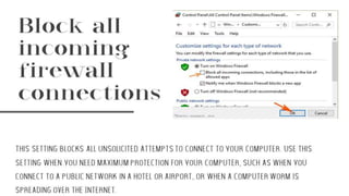 The document defines different types of firewalls and their purposes. It discusses firewall design principles like establishing controlled links and protecting networks from internet attacks. There are four main types of firewalls: proxy, stateful multilayer inspection, packet filtering, and circuit level gateway. Proxy firewalls act as gateways for specific applications. Stateful multilayer inspection firewalls monitor active connections to determine which network packets to allow. Packet filtering firewalls work at the TCP/IP layers to filter packets. Circuit level gateway firewalls rely on packet headers to filter sessions. More complex firewall configurations beyond single systems are also possible.
