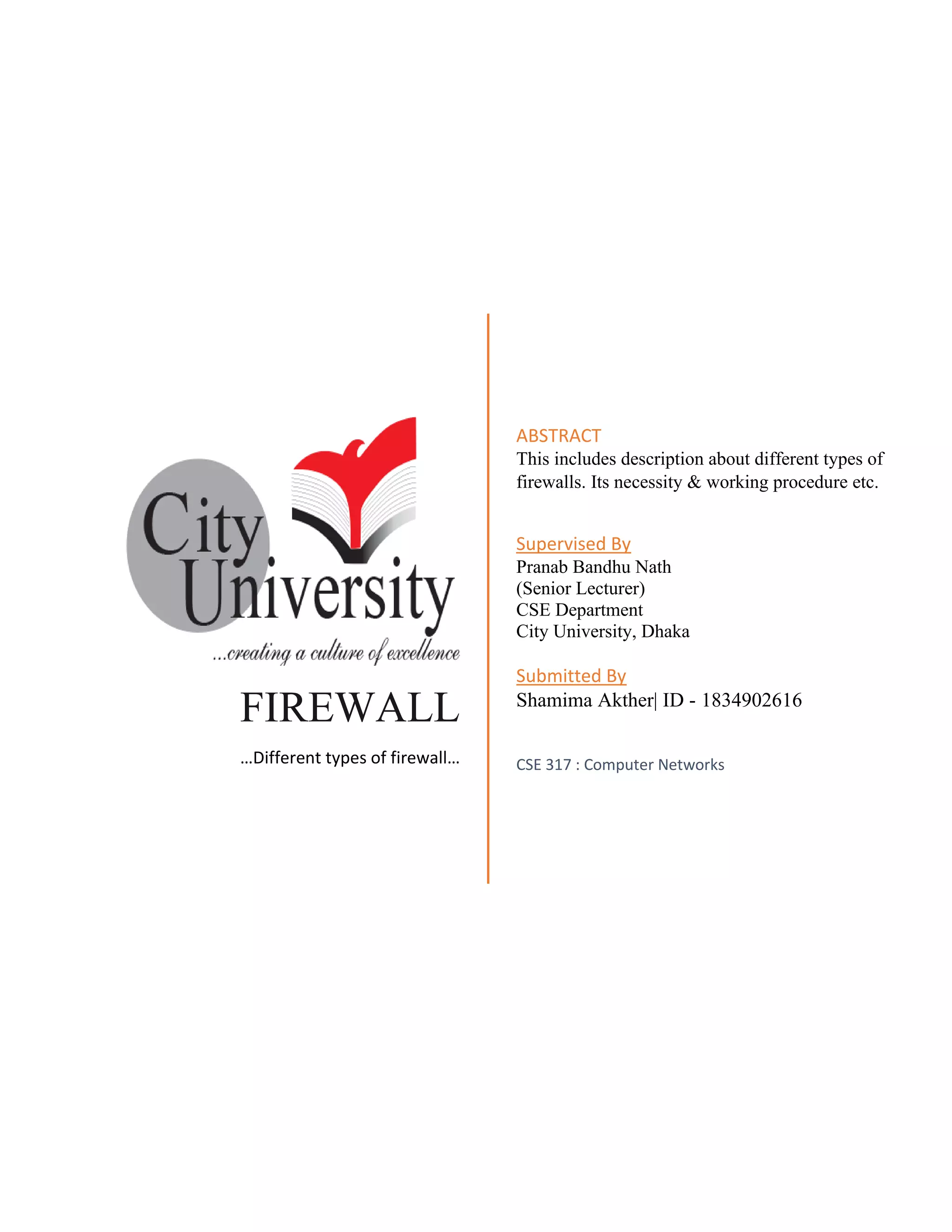 Firewalls monitor and filter network traffic based on security policies. There are different types of firewalls that use various methods like packet filtering, application-level gateways, stateful inspection, and more. Firewalls are necessary to protect networks from threats and work by allowing approved traffic while blocking dangerous traffic according to pre-set policies. They defend networks by detecting and responding to malware and other attacks across the entire system.