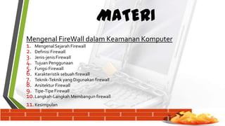 Dokumen tersebut membahas tentang firewall dan keamanan komputer. Ia menjelaskan definisi firewall, jenis-jenisnya, fungsi dan teknik yang digunakan firewall, serta langkah-langkah membangun firewall untuk melindungi jaringan dari ancaman di internet.
