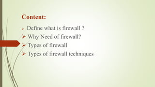 A firewall is a device or software that provides secure connectivity between internal and external networks by protecting confidential information from unauthorized access, and defending the network and its resources from malicious external users and accidents. There are two main types of firewalls - hardware firewalls which are physical devices that can protect an entire network but are more expensive and complex, and software firewalls which protect individual computers and are cheaper and simpler to configure. Firewall techniques include packet filtering, application gateways, proxy servers, circuit-level gateways, and bastion hosts.