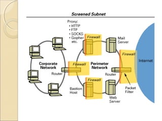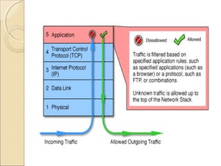 The document discusses firewalls, which are essential software or hardware applications that protect devices from harmful data packets. It outlines the history, generations, types, architectures, advantages, and disadvantages of firewalls, detailing packet filters, stateful filters, application layer firewalls, and various firewall architectures. The conclusion emphasizes the necessity of firewalls in modern networks to enhance security despite their limitations.
