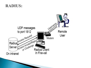Firewalls are used to securely interconnect private networks to the Internet and protect them from external threats. They implement an organization's security policy by filtering network traffic and only allowing authorized connections based on properties like source/destination addresses and ports. There are different types of firewalls that operate at various layers of the network model and use techniques like packet filtering, application proxies, authentication, and content inspection to enforce security. Organizations should choose a firewall configuration based on their specific security needs, from dual-homed gateways to screened subnets in demilitarized zones.