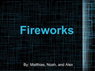 The document discusses the parts, chemical reactions, and history of fireworks. It describes the main components of fireworks like the black powder fuse, bursting charge, and break. The chemical reaction involves adding raw materials, igniting an energy source to start the reaction, and using the fuse to light the black powder and cause the firework to explode. Different chemical compounds produce different colors when burned. The history section notes that fireworks originated in China and were brought to Italy by Marco Polo. Safety tips recommend having a designated shooter, only using fireworks outdoors, and being prepared with water and safety glasses.