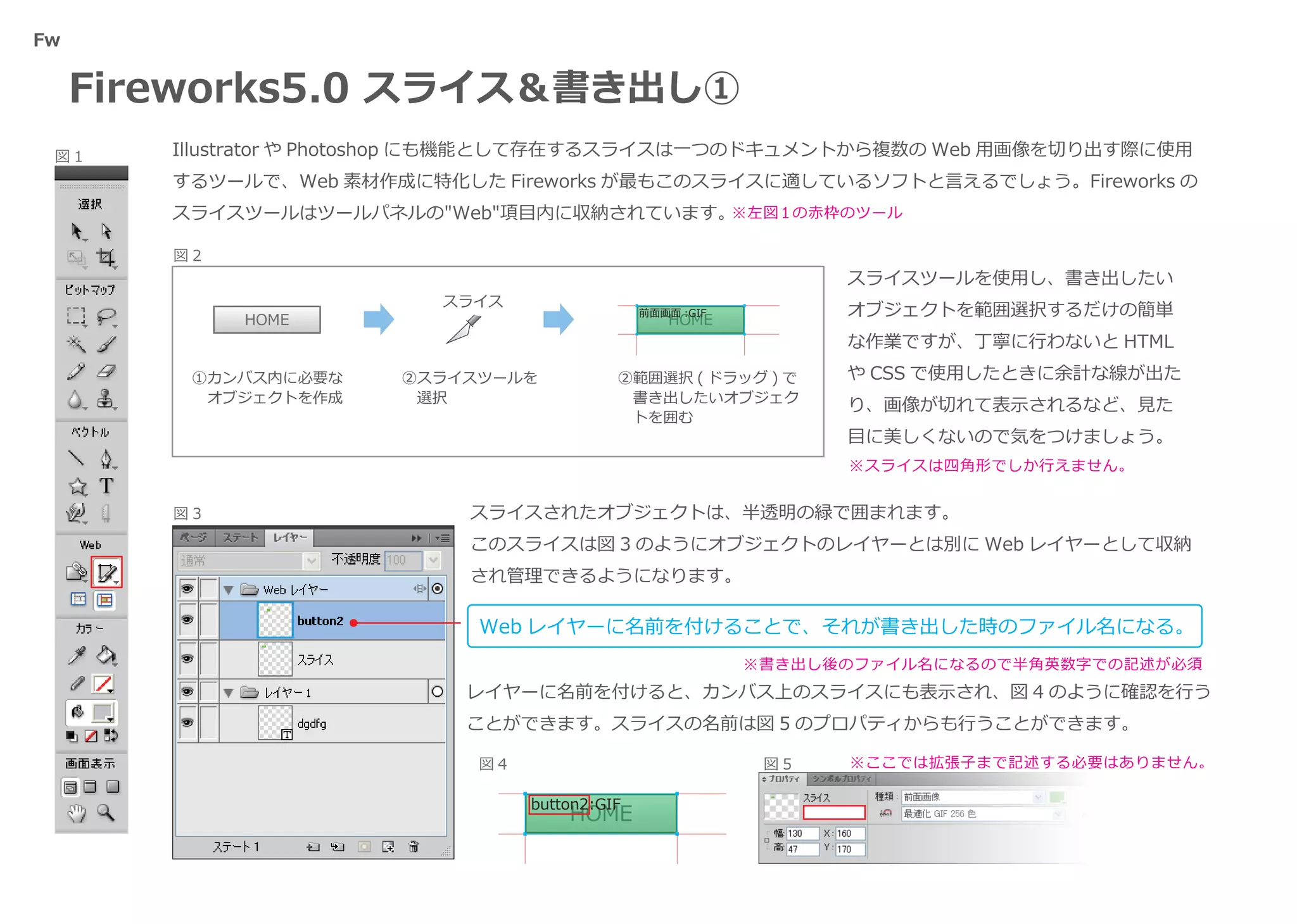 Fireworks5.0 スライス&書き出し① 図1 Illustrator や Photoshop にも機能として存在するスライスは一つのドキュメントから複数の Web 用画像を切り出す際に使用 するツールで、Web 素材作成に特化した Fireworks が最もこのスライスに適しているソフトと言えるでしょう。Fireworks の スライスツールはツールパネルの″Web″項目内に収納されています。※左図 1 の赤枠のツール 図2 スライスツールを使用し、書き出したい スライス HOME 前面画面 :GIF HOME オブジェクトを範囲選択するだけの簡単 な作業ですが、丁寧に行わないと HTML ①カンバス内に必要な ②スライスツールを ②範囲選択 ( ドラッグ ) で や CSS で使用したときに余計な線が出た オブジェクトを作成 選択 書き出したいオブジェク り、画像が切れて表示されるなど、見た トを囲む 目に美しくないので気をつけましょう。 ※スライスは四角形でしか行えません。 図3 スライスされたオブジェクトは、半透明の緑で囲まれます。 このスライスは図 3 のようにオブジェクトのレイヤーとは別に Web レイヤーとして収納 され管理できるようになります。 Web レイヤーに名前を付けることで、それが書き出した時のファイル名になる。 ※書き出し後のファイル名になるので半角英数字での記述が必須 レイヤーに名前を付けると、カンバス上のスライスにも表示され、図 4 のように確認を行う ことができます。スライスの名前は図 5 のプロパティからも行うことができます。 図4 図5 ※ここでは拡張子まで記述する必要はありません。 button2:GIF HOME