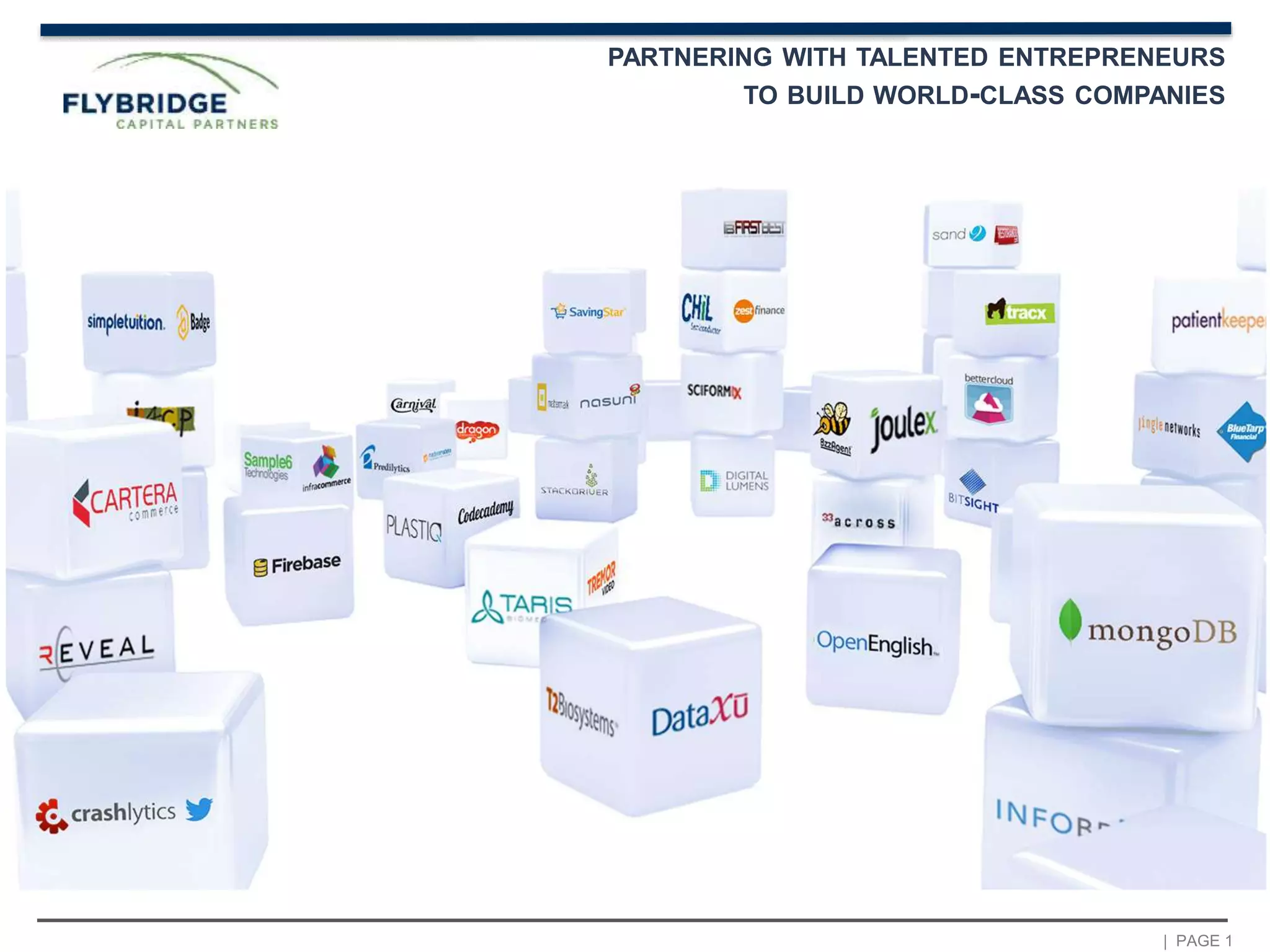Flybridge Capital Partners is a venture capital firm that partners with talented entrepreneurs to build world-class companies. They focus on investing in next generation enterprise software startups based in New York City and Boston. Flybridge provides seed or early stage investment and works closely with companies to help them succeed through guidance, resources, and business support.
