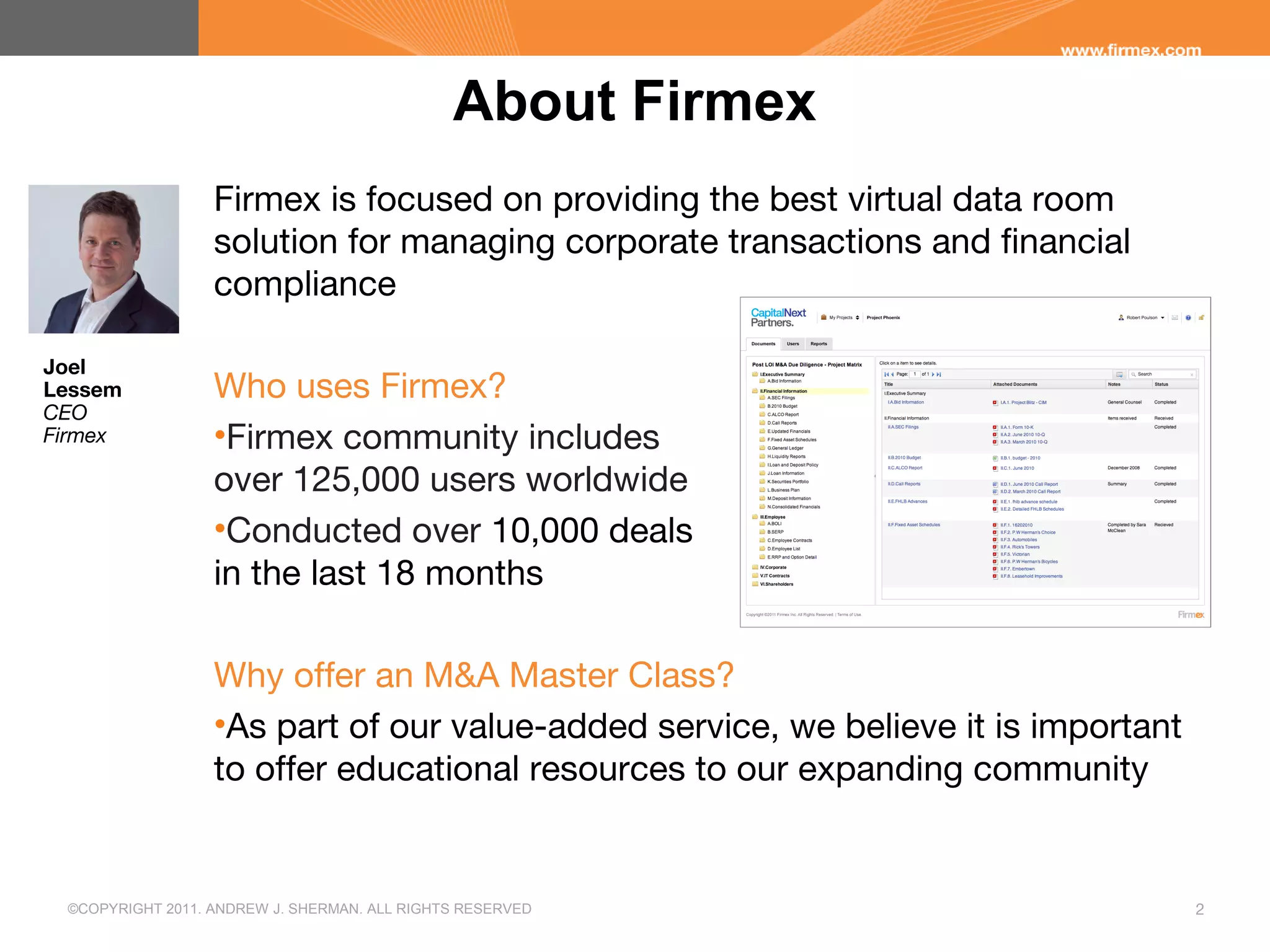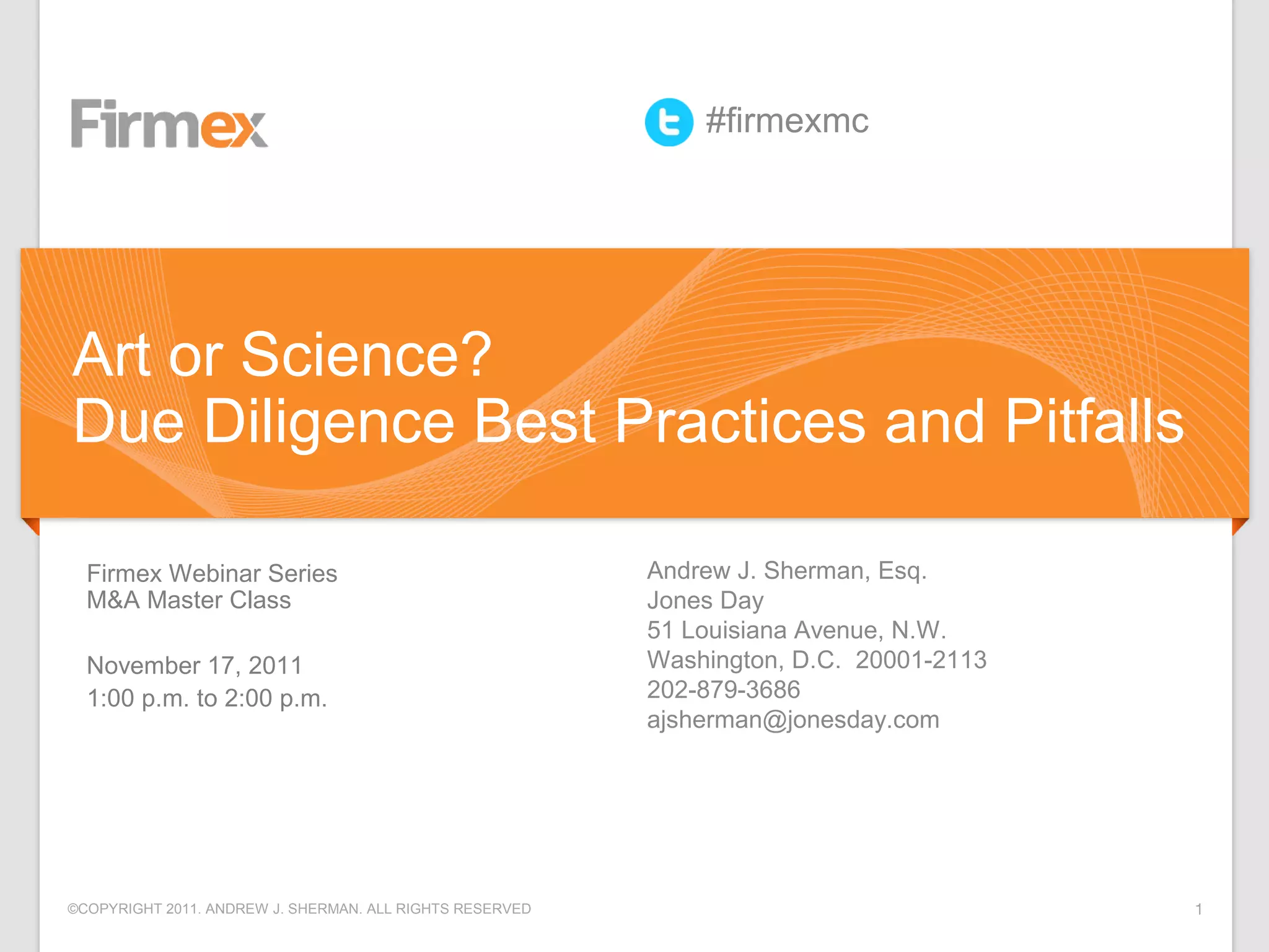 The document outlines best practices and common pitfalls in the due diligence process during M&A transactions, emphasizing its dual nature as both an art and a science. It highlights the importance of thorough preparation, effective communication, and the organization of due diligence teams, while also discussing the impact of external events and common mistakes made by buyers. Additionally, it emphasizes the role of virtual data rooms in facilitating efficient due diligence and the necessity of addressing potential legal issues and risks associated with transactions.