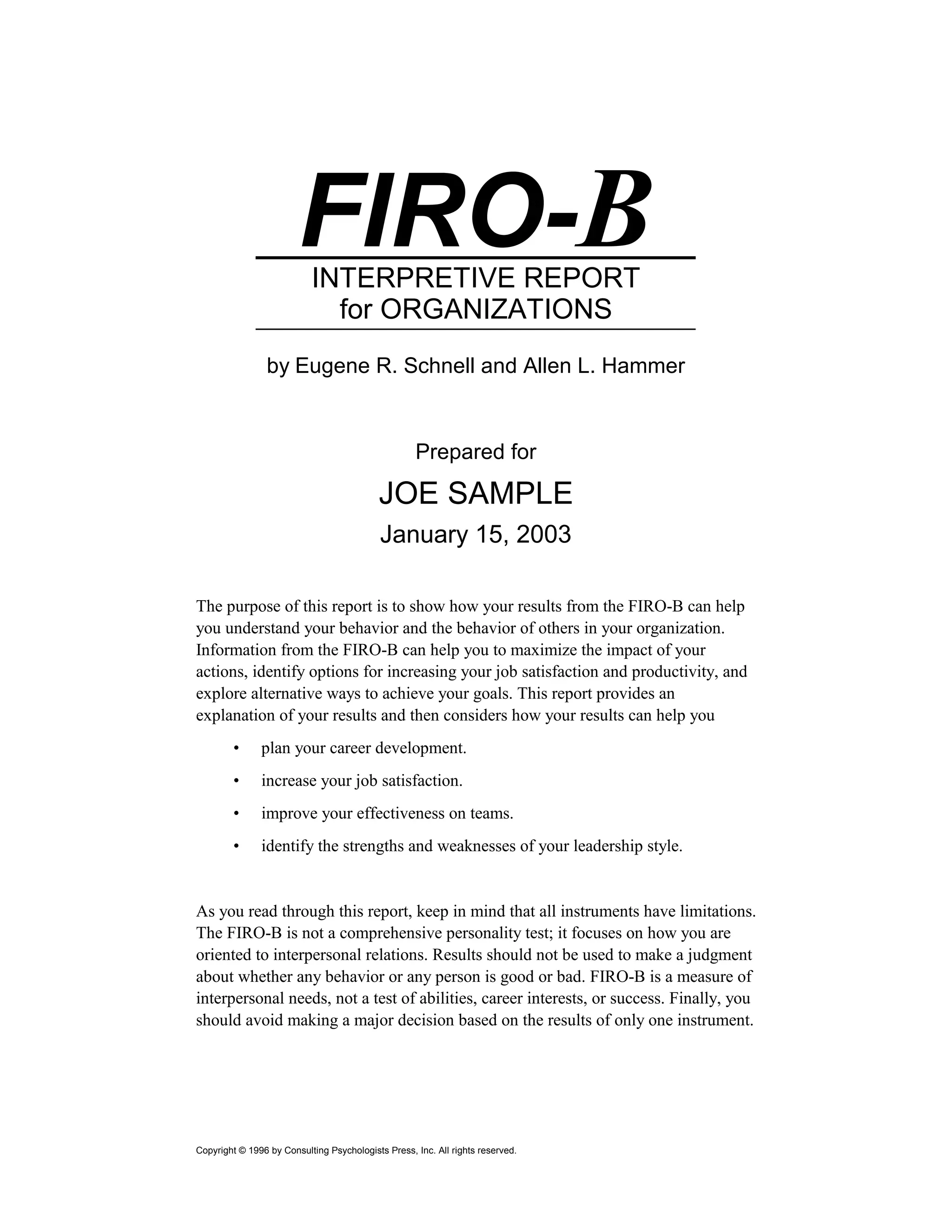 This document provides an interpretive report of results from the FIRO-B assessment for an individual named Joe Sample. The report explains the FIRO-B measures interpersonal needs in three areas: inclusion, control, and affection. It provides Joe's results, including his expressed and wanted behaviors for each need as well as his overall interpersonal needs. The report then analyzes Joe's results, discussing his patterns of need fulfillment and how his interpersonal needs may influence his career development opportunities and satisfaction.