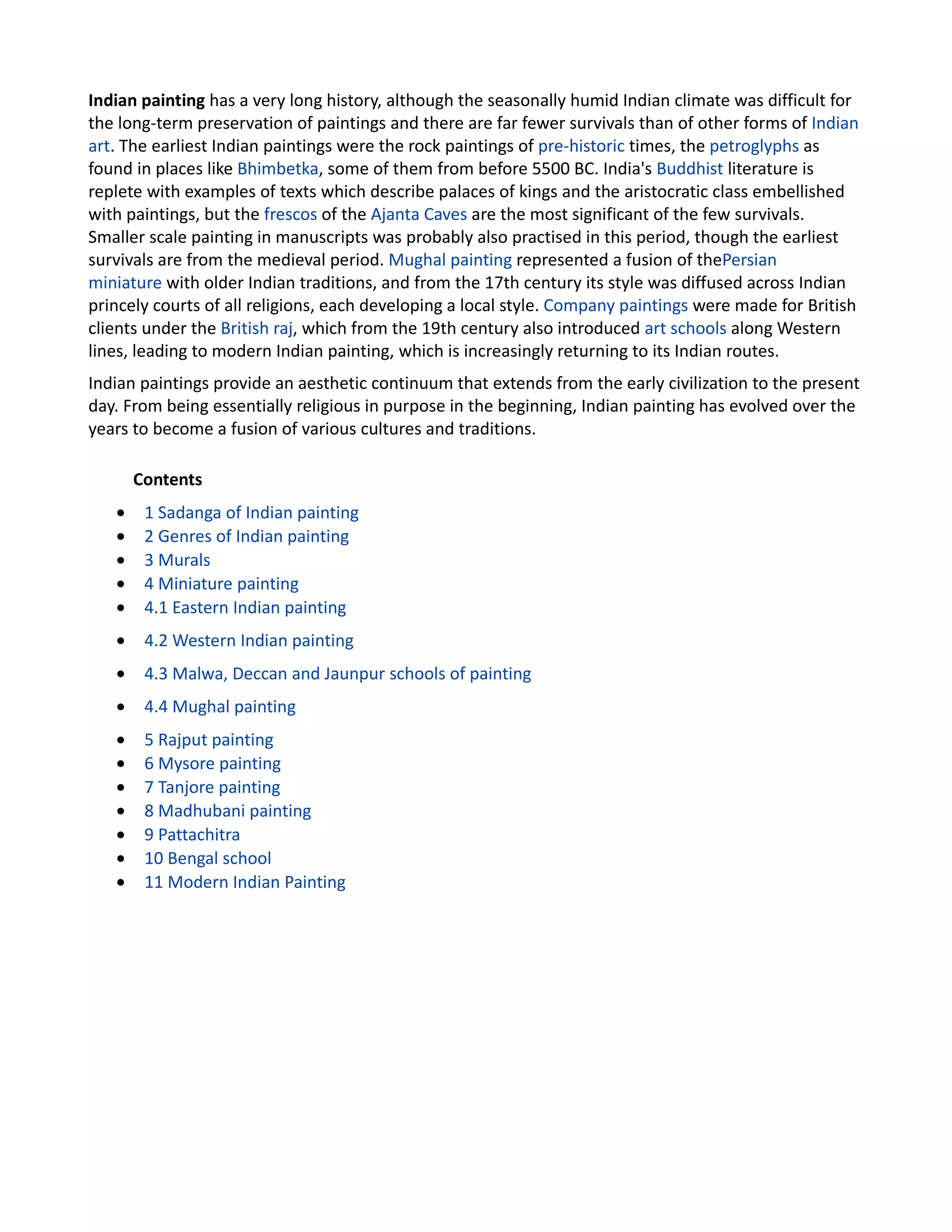 Indian painting has a very long history dating back to pre-historic rock paintings. The earliest significant surviving paintings are the frescoes from the Ajanta Caves from the 5th century BC. Through the medieval period, manuscript painting was practiced but early survivals are rare. Mughal painting represented a fusion of Persian miniature and Indian traditions and spread to princely courts across India in the 17th century. Company paintings were made for British patrons under British rule and introduced Western art schools in the 19th century, leading to modern Indian painting with returning Indian influences. Indian painting provides an aesthetic continuum from ancient times to the present.