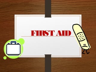 First aid is initial treatment for injuries or illnesses before medical help arrives. It aims to preserve life, prevent worsening conditions, and promote recovery. Responsibilities of a first aider include assessing situations safely, protecting casualties, identifying injuries, treating the most serious conditions first, arranging for removal to further care, and remaining with casualties until help arrives. Conditions covered include hyperventilation, fainting, shock, cramps, choking, fractures, dislocations, strains, sprains, and bleeding. Treatment priorities are breathing, bleeding, and bones. Recovery position is recommended for unconscious casualties.