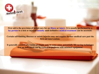 This document provides information on first aid techniques for various common injuries and illnesses. It describes the basic aims and procedures for treating simple slips, trips or falls; suspected complex slips, trips or falls; severe burns and scalds; and cuts and wounds. The document emphasizes the importance of proper first aid care, including cleaning wounds, applying pressure to stop bleeding, immobilizing injured limbs, and seeking immediate medical help for serious injuries.