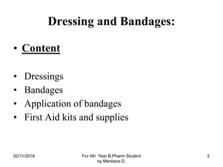 This document provides information on dressing wounds and applying bandages. It discusses different types of dressings, including sterile dressings, gauze pads, and adhesive strips. It also describes various bandage materials and how to apply them properly, including roller bandages, triangular bandages, and elastic bandages. The document emphasizes the importance of cleaning wounds, applying dressings large enough to extend beyond the edges of wounds, and not bandaging too tightly. It outlines several bandage techniques like arm slings and ring pads.