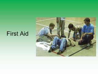 First aid is emergency medical treatment given before full medical attention arrives. The primary survey uses DRABC to assess danger, response, airway, breathing, and circulation. CPR involves chest compressions and rescue breathing if there is no pulse or breathing. Bleeding is managed through direct pressure, elevation, and bandages without removing objects. Fractures are immobilized and head and spinal injuries require maintaining the airway and not moving the victim.