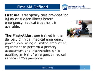 This document outlines the key elements of establishing a workplace first aid program according to OSHA regulations. It discusses defining first aid and the roles of first aiders. The four essential program elements are identified as management leadership, worksite analysis, hazard prevention and control, and safety training. Basic program requirements around assessing risks, complying with OSHA, and stocking appropriate first aid supplies are also covered. Employer responsibilities in training first aiders, documenting the program, and evaluating it are summarized. Common workplace injuries and their costs are briefly mentioned.