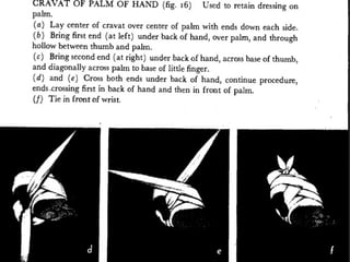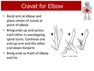 First aid involves the immediate care given to someone who is injured or suddenly ill. Bandaging is used to support fractured bones, immobilize dislocated joints, apply pressure to stop bleeding, secure dressings, and retain splints. A triangular bandage has three sides and can be folded into different shapes like a cravat for bandaging purposes such as dressing foot injuries. Safety should always be the top priority when providing first aid.