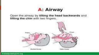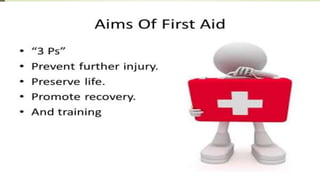The document discusses the concepts of first aid and emergency medical services. It defines first aid as immediate care provided by a bystander to an injured or ill person until medical treatment can be accessed. The history of organized first aid is traced back to religious orders in the 11th century, with modern concepts developing in the late 19th century with organizations like the Red Cross. The principles of first aid are described as acting quickly but with a calm demeanor, gaining the patient's trust, and preventing worsening of conditions. The components of emergency medical systems are outlined, along with the DRABC action plan for assessing patients.