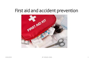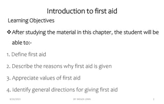 The document provides information on first aid and accident prevention. It defines first aid and outlines its importance, including preserving life, preventing further injury, and promoting healing. It also discusses general directions for providing first aid, such as assessing safety, identifying the problem, prioritizing patients, extricating victims, and arranging transportation. Additionally, it covers topics like the definition of important terms, reasons for giving first aid, values of training, and emergency patient assessment techniques.