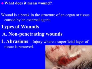1) The types of wounds including abrasions, lacerations, contusions, avulsions, incisions, stab wounds, amputations, and gunshot wounds.