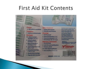 Gauze can be used to put pressure on cuts to stop or control bleeding. Disposable gloves should be worn to prevent contact with blood and blood borne pathogens. Scissors can cut clothing away from injuries so wounds can be treated directly.