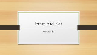 This document provides information about a small first aid kit containing 85 pieces. The kit includes antiseptic towelettes, alcohol wipes, a cold compress, antibiotic ointment, adhesive bandages, adhesive tape, gauze pads, butterfly closures, cotton swabs, finger splints, examination gloves, and a first aid guide. The document recommends adding a gauze bandage, ACE bandage, tweezers, and scissors. It describes three common ways a first aid kit can be used: at home, while traveling, and to treat minor ailments like cuts.