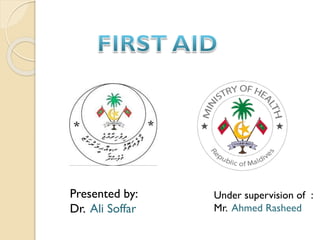 This document provides an overview of basic first aid topics including bleeding, burns, blisters, fractures, sprains, insect bites, and fever. It discusses how to treat bleeding by applying direct pressure to the wound, how to treat burns by stopping the burning process and flushing with cool water, and how to treat blisters by draining fluid with a sterile needle. It also covers immobilizing fractures with splints, reducing swelling from insect bites, removing foreign objects from the body, and controlling fever through medication, baths, and fluids. Key points are distinguishing between loss of consciousness and unresponsiveness, with the latter requiring immediate CPR.