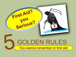 The document outlines 5 golden rules for first aid: 1) Prevent preventable death by providing timely treatment, 2) Reduce anxiety and discomfort, 3) Reduce pain, 4) Watch out for your own safety, and 5) Call for help when needed. It emphasizes the importance of first aid training and practicing the rules with good judgment to potentially save lives in emergency situations before emergency services arrive.