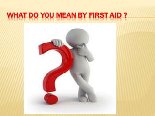 1. First aid involves providing immediate care for injuries and illnesses until full medical treatment can be received.
