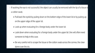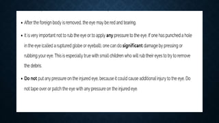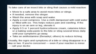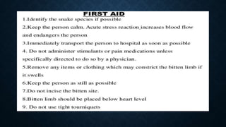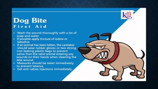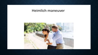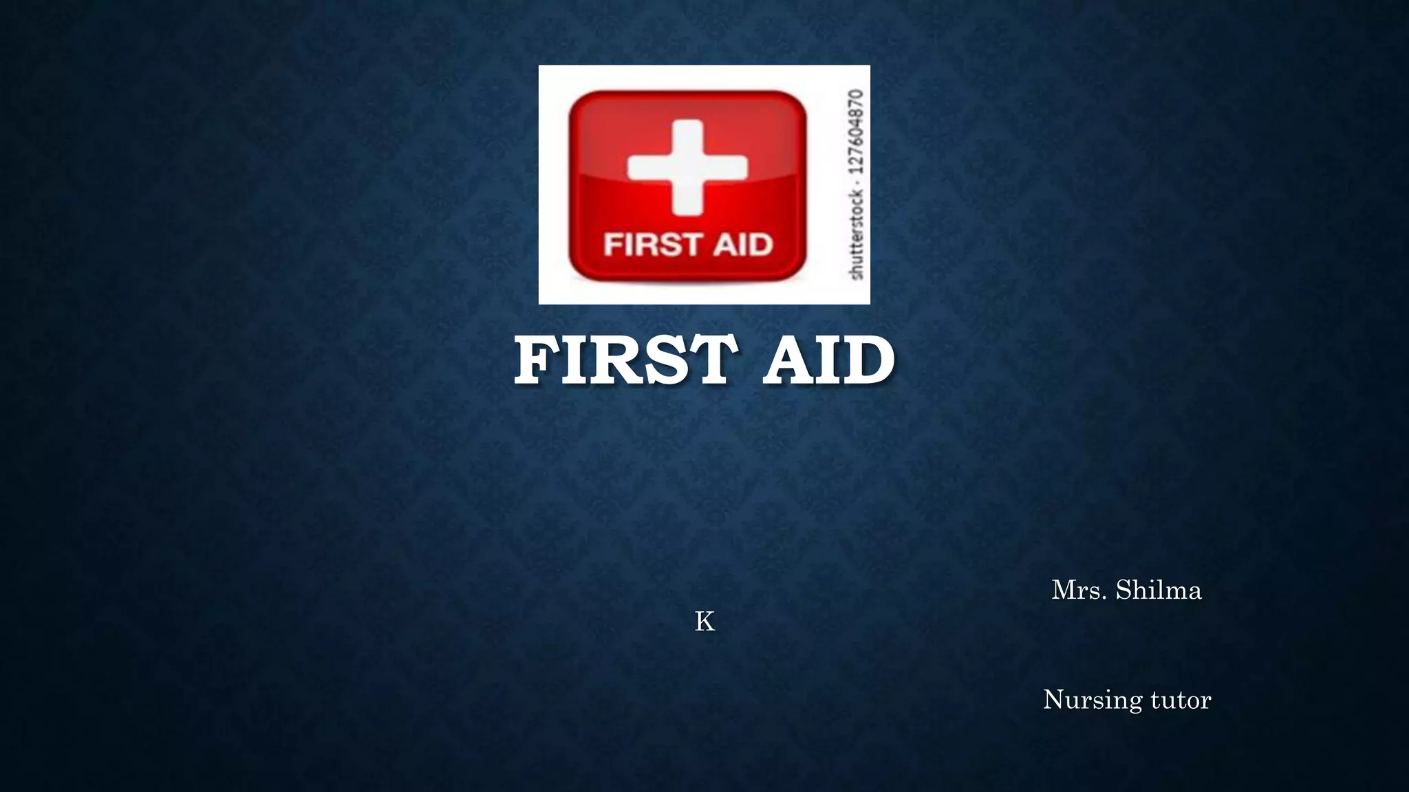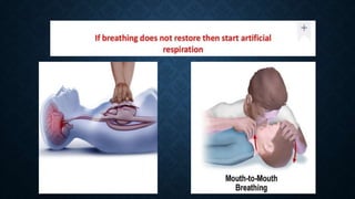 First aid is providing immediate care to someone who is injured or ill. The key priorities of first aid are maintaining an open airway, ensuring breathing and circulation. Common conditions requiring first aid include asphyxia, drowning, shock, wounds, burns, injuries, foreign objects, and poisoning. For each condition, the summary outlines signs and symptoms and provides recommendations for initial management and care until emergency medical services arrive.