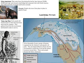 1. The first Americans came from Asia between 20,000-20,000 years ago during the last Ice Age when lower sea levels exposed a land bridge connecting Asia and North America. They followed animal herds as nomads across this land bridge.