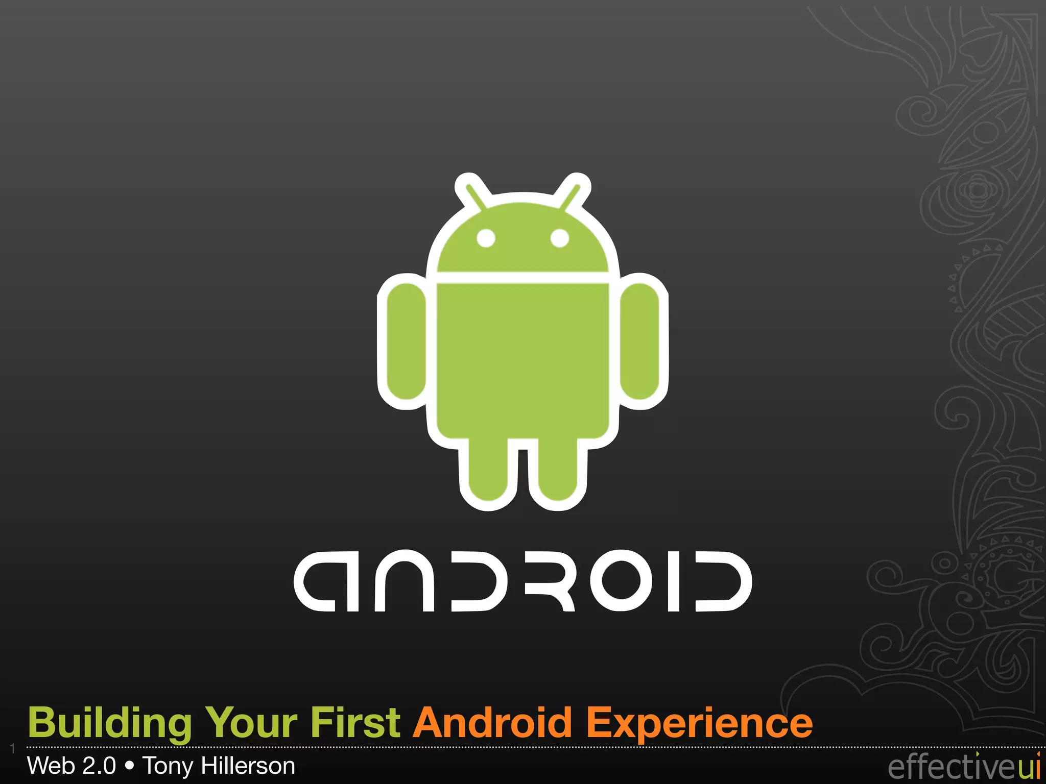 This document provides an overview of building a first Android experience. It introduces Android as an operating system for mobile devices and open source framework. It then covers key aspects of the Android platform like activities, services, intents, and content providers. The document concludes with recommendations on resources for learning Android development and a sample app that demonstrates using the camera, data persistence, location services, and styling.