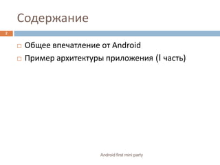 Так за чтоже тогда его любить?За его молодостьЗа работу над ошибками (3.0 мммм:)За открытые исходные кодыЗа его ориентированность на разработчиковЗа бесконечные возможности9Android first mini party