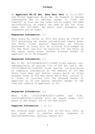 The document is a first appeal under the Right to Information Act 2005 filed by Om Prakash, citing a refusal to provide information concerning threats to life and liberty. The appellant argues that the requested information is critical to prevent planned judicial murders and requests an expedited hearing by a full bench of the Central Information Commission. The appeal emphasizes the urgency of the situation, asserting that lack of information jeopardizes the wellbeing of the appellants involved.
