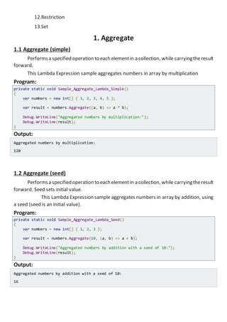 LINQ, or Language Integrated Query, is a syntax integrated into programming languages like C# and VB.NET, used for querying various types of data, such as relational data, XML, and objects. It offers a range of standard query operators and capabilities through providers like LINQ to Objects, Entities, and SQL, simplifying data querying and enhancing code readability. This document provides examples of several LINQ operations including aggregation, conversion, and element retrieval, showcasing the functionality and usage of LINQ in programming.