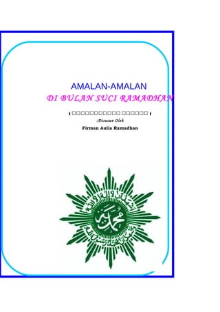 Dokumen ini membahas amalan-amalan yang dianjurkan di bulan Ramadhan seperti puasa, membaca Al-Quran, shalat Tarawih berjamaah, memperbanyak ibadah pada malam Lailatul Qadar, beri'tikaf, sedekah, dan umrah. Dokumen ini juga menjelaskan contoh-contoh perilaku Nabi Muhammad SAW dalam menjalankan ibadah-ibadah tersebut.