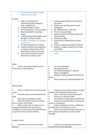 This document summarizes an audit of an Eco School in Jaworznia, Poland with 253 students and 30 teachers. It identifies several weak and strong points regarding resource use and environmental impact. Among the weak points are a lack of recycling bins and signage, mixed waste collection, and traditional light bulbs. Strong points include LED lighting, recycling programs, and educating students on waste segregation. The audit also reviews specific areas like classrooms, toilets, corridors, and the school grounds, identifying further opportunities for improving resource efficiency and environmental practices.