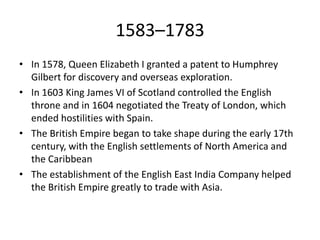 The First British Empire began taking shape in the early 17th century through English settlements in North America and the Caribbean. Key events included the founding of Jamestown in 1607, establishing England's first permanent settlement in North America, and the establishment of the East India Company, which helped Britain greatly expand trade with Asia. During this time, from 1583 to 1783, slavery also became the basis of the British Empire in the West Indies, with Britain responsible for transporting over 3.5 million African slaves to the Americas until the abolition of the slave trade in 1807.