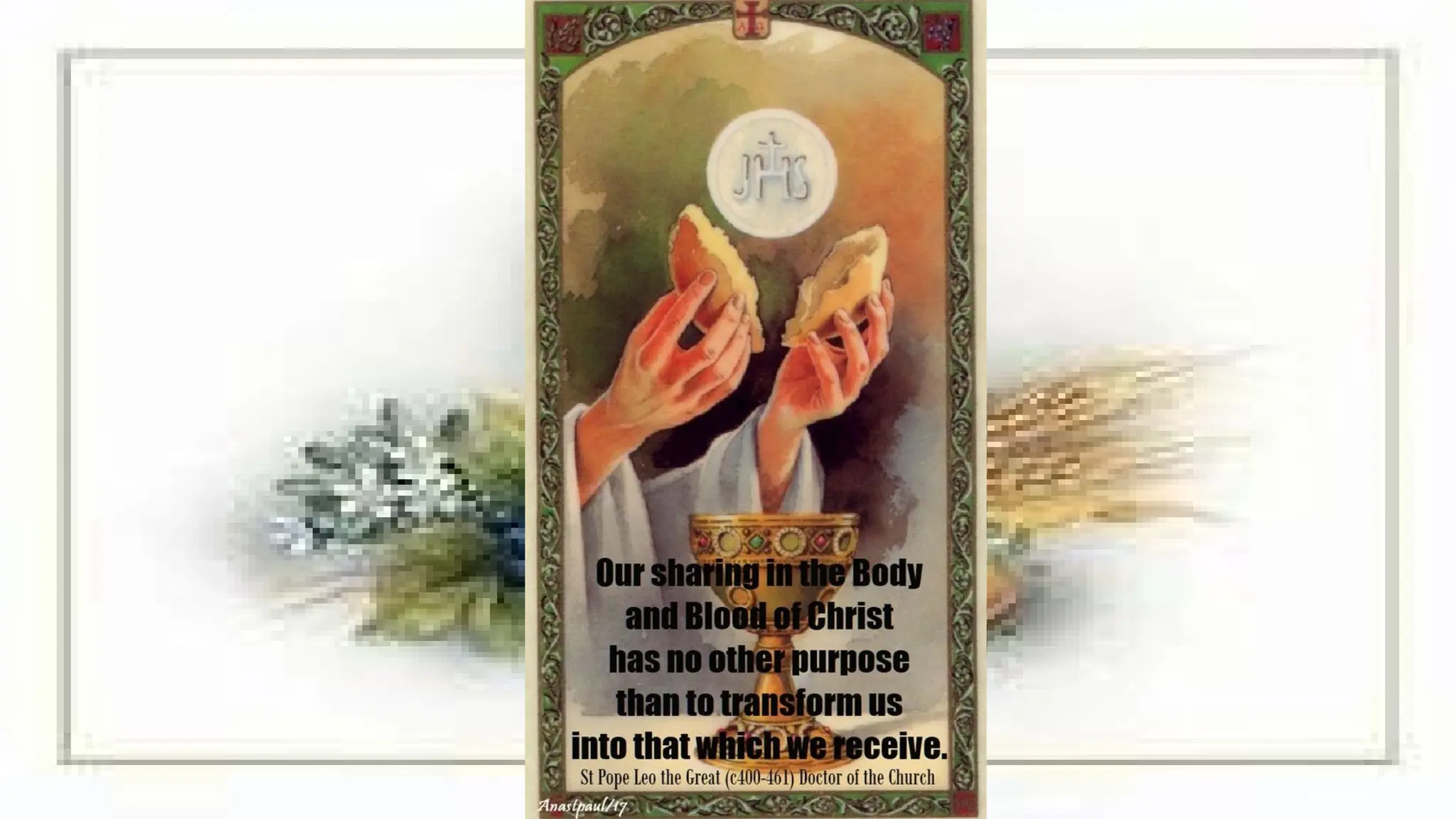 The document discusses the significance of the Eucharist in the Christian faith, describing it as a sacrament that unites believers with Christ and each other. It elaborates on the concept of transubstantiation, where bread and wine become the body and blood of Christ, and outlines the order of the Mass. Additionally, it highlights the fruits of receiving Holy Communion, such as spiritual nourishment and community strengthening.