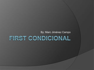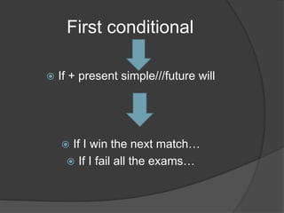 This document discusses the first conditional in English grammar. It explains that a first conditional sentence uses "if" plus the present simple in the if-clause and "will" plus the infinitive in the main clause. It provides examples of first conditional sentences and their reverse order. The document also gives practice examples and their solutions using the first conditional structure.