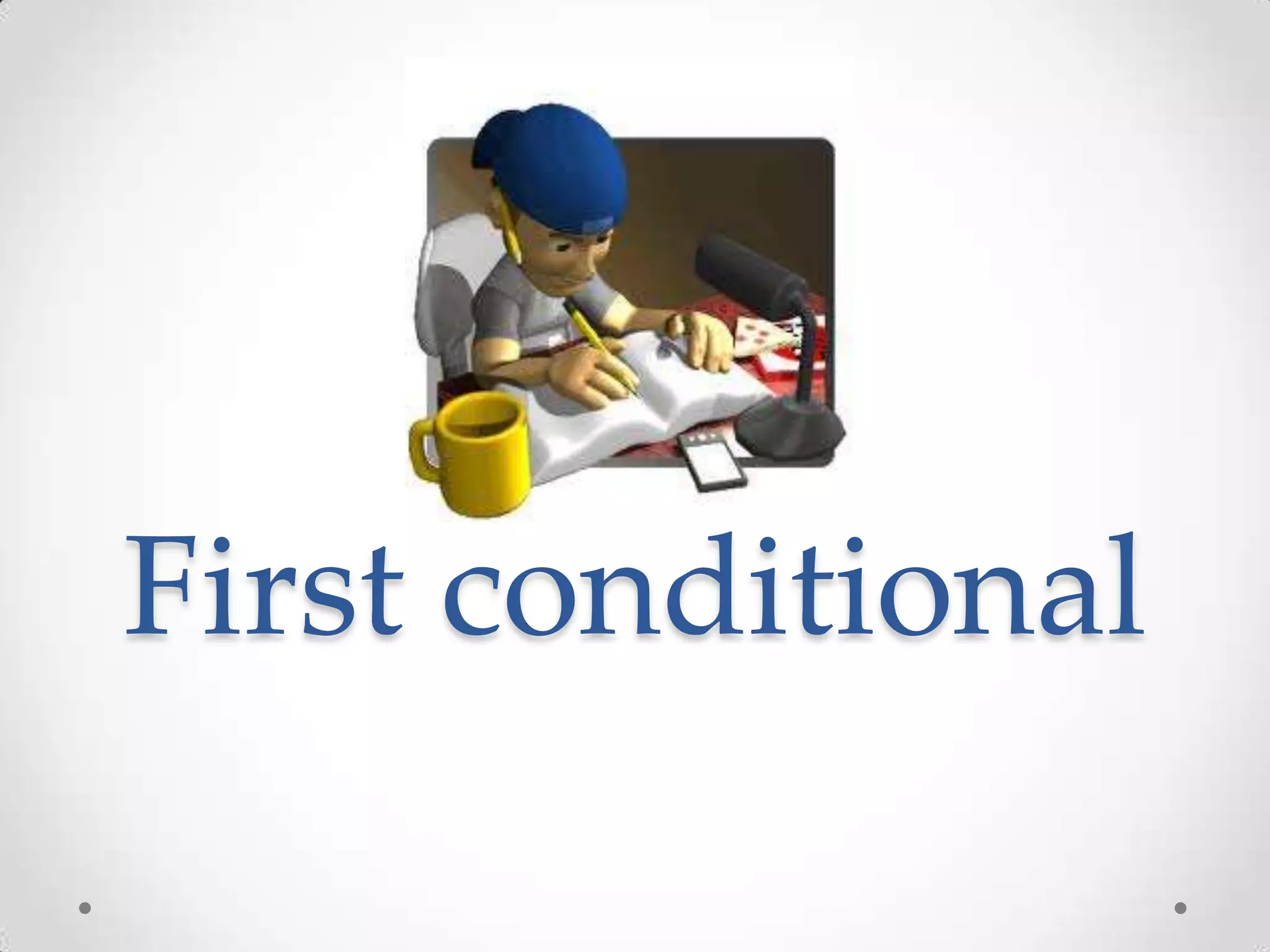 This document discusses the first conditional, which is used to talk about possible or imaginary situations in the present or future. It provides examples of sentences using the first conditional, including "If I have time, I will visit my grandparents" and "If it rains, we will stay home." The document also prompts the reader to create their own sentences using the first conditional structure.