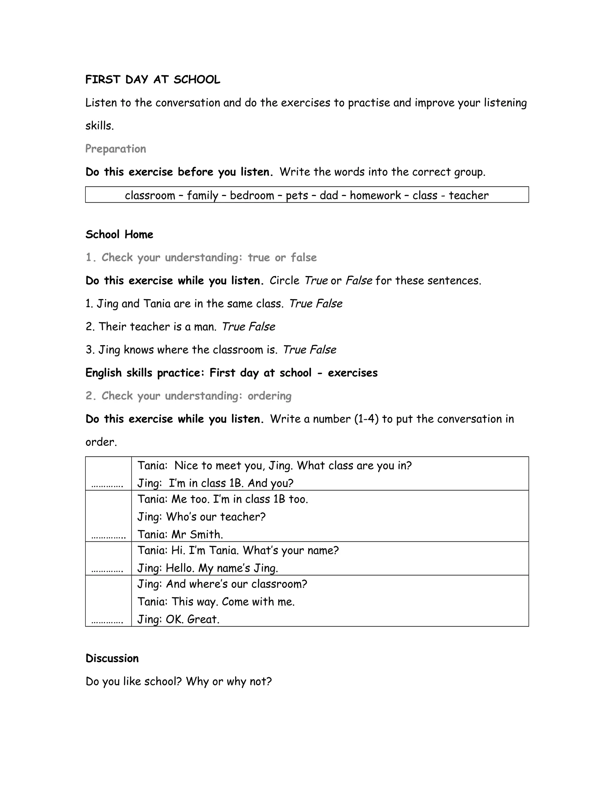 Jing and Tania meet on the first day of school. They discover they are in the same class, 1B, and have the same teacher, Mr. Smith. Tania helps Jing find their classroom. The document provides exercises for students to practice their listening comprehension, including identifying whether sentences about the conversation are true or false and ordering the events of the conversation. It concludes by asking students if they like school and why or why not.