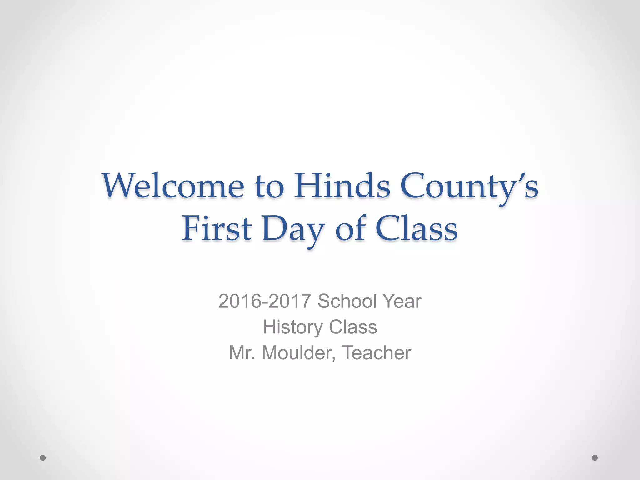 Mr. Moulder teaches history and outlines his philosophy of education which emphasizes being prepared and aiming high. He details policies around class attendance, grading, homework, and dress code. Mr. Moulder introduces himself, sharing that he is from Tennessee, played college baseball, and loves history. He expects all students to give their best effort daily and notes he is available to help students be successful.