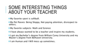 This document provides information for students from their 6th grade teacher, Miesha Holloway. It outlines her educational background, expectations for student behavior and assignments, classroom procedures, and goals to have a productive school year. Students are expected to be respectful, complete all work, and follow school rules. The teacher aims to reward positive behavior and provide consequences for any issues. Her overall message is that students should believe in themselves to have a successful year.
