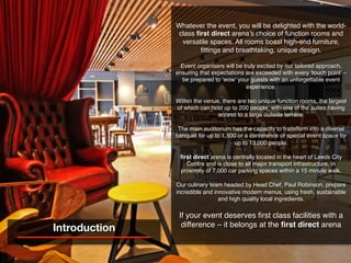 The document summarizes the event spaces and facilities available at the first direct arena in Leeds. It describes two unique function rooms that can hold up to 200 people, as well as a main auditorium that can accommodate up to 1,500 for a banquet or 13,000 for a conference. The arena offers world-class amenities including a 2500 square meter main exhibition floor, catering services, production support, and accessibility. It is centrally located in Leeds with nearby parking and transportation.