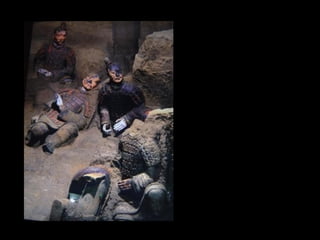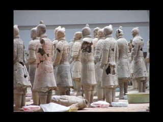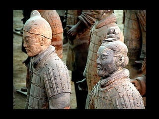 Qin Shi Huang, the first emperor of unified China from 221-210 BCE, implemented significant reforms including standardization of currency, weights and measures, and a national road system. He also commissioned the construction of the Great Wall to defend against Mongols and relocated court families to solidify his power. The tomb of the first emperor features the famous terracotta army and represents an important archaeological site with remnants dating back over 2000 years.